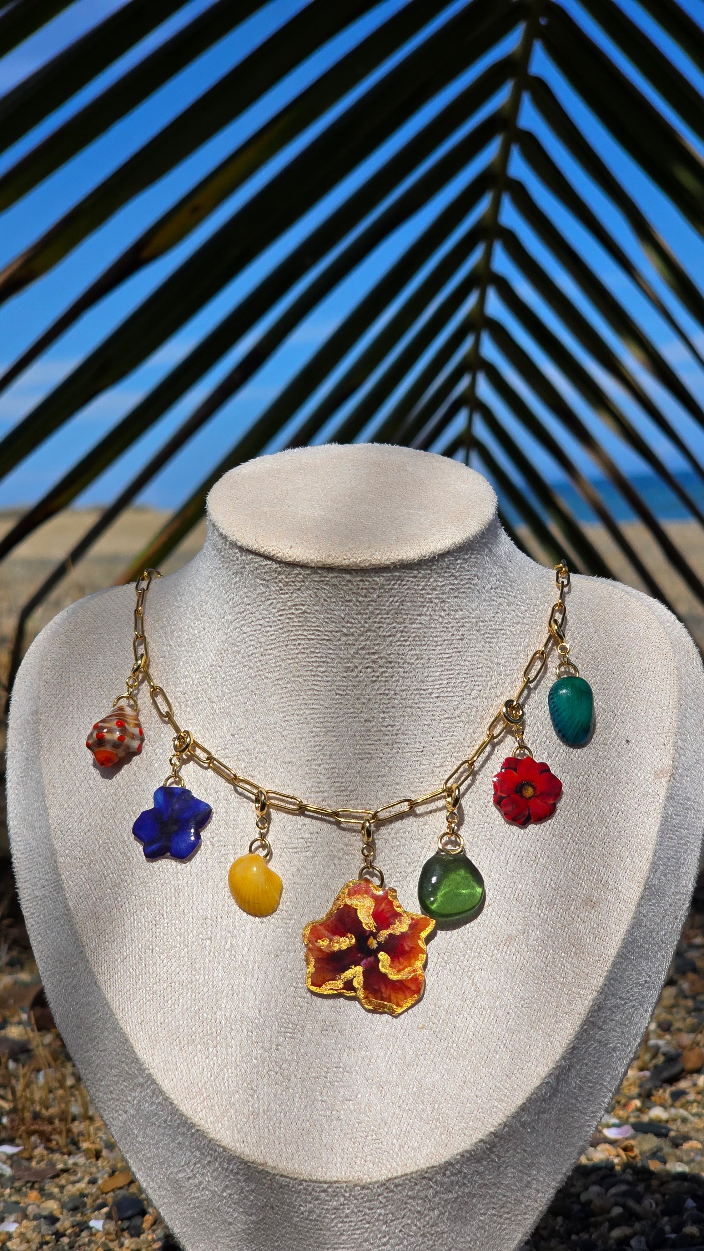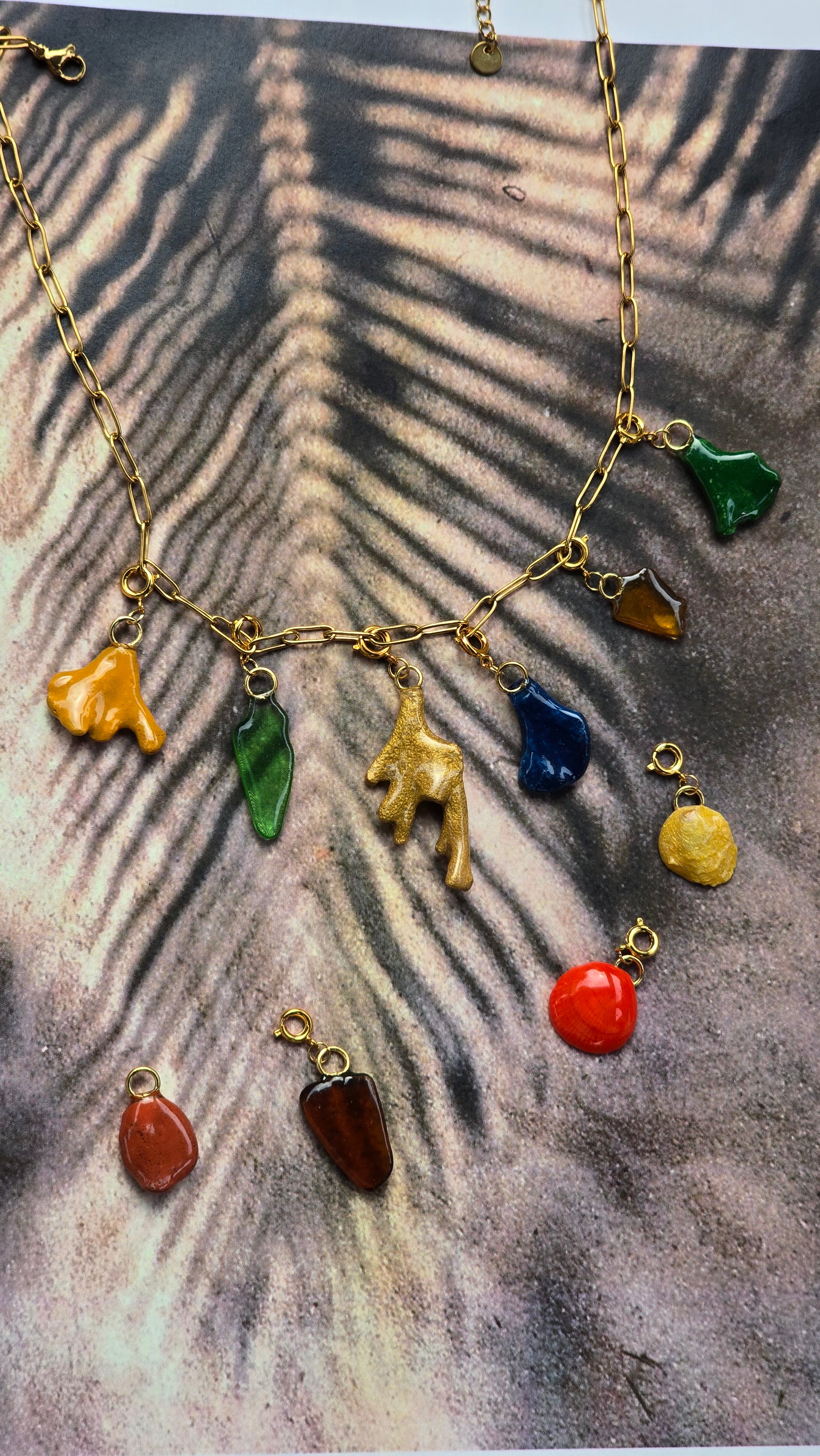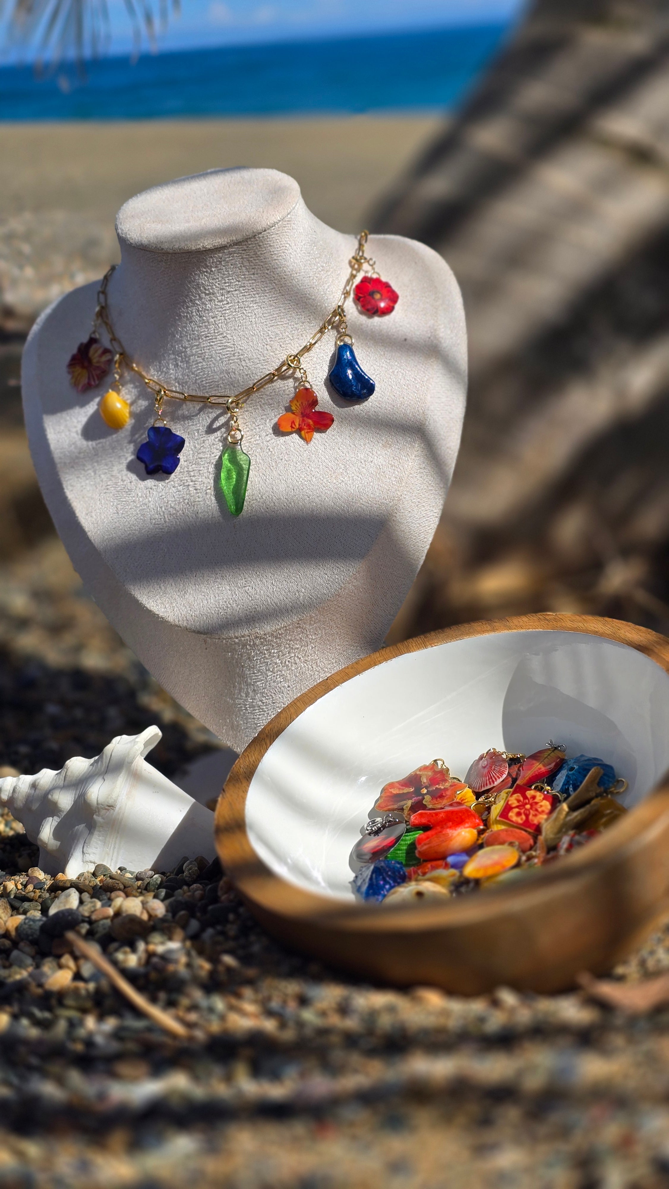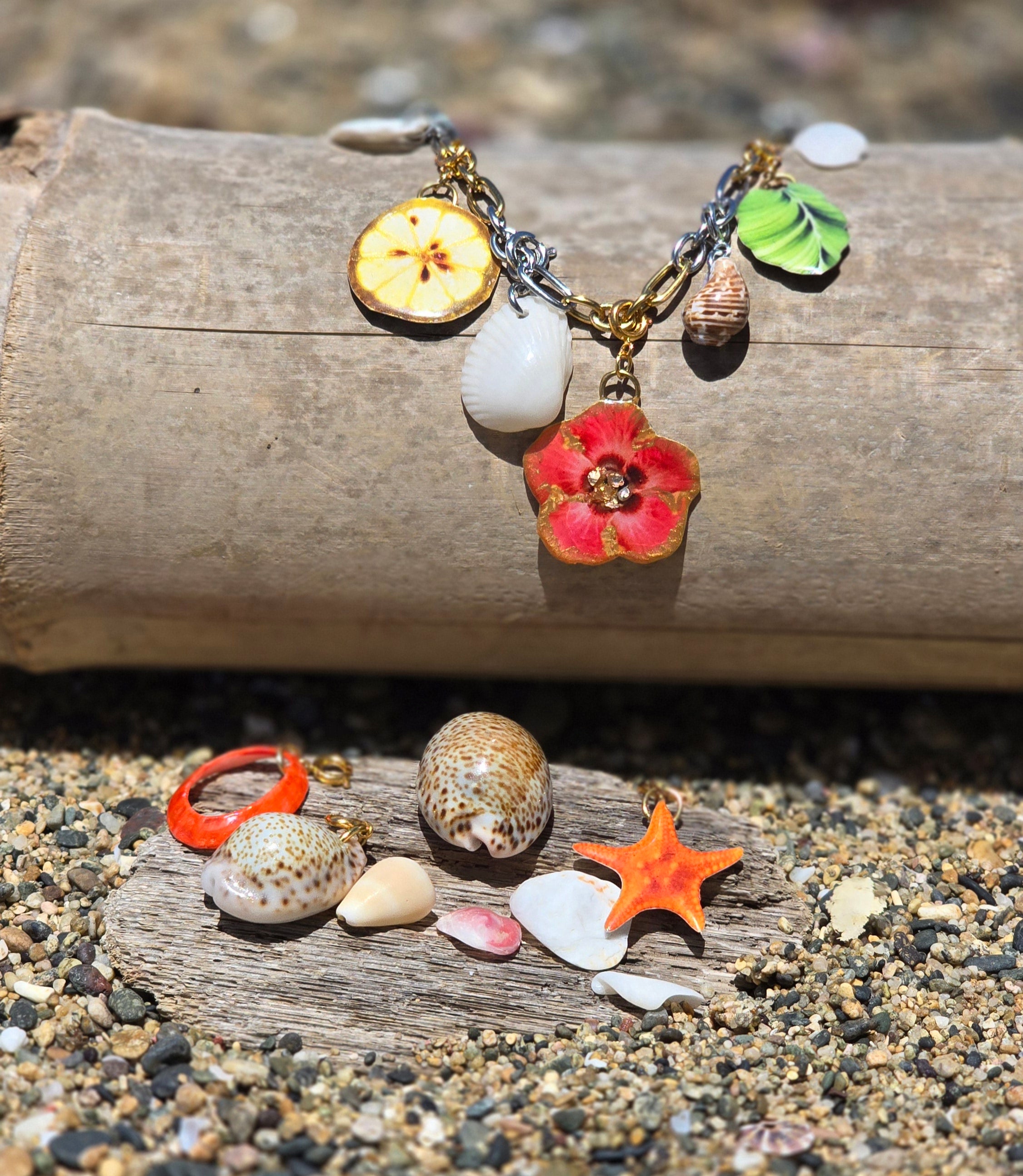 Son charms artesanales intercambiables hechos en resina, donde encapsulamos detalles personalizados y conchas marinas. Diseñados para llevar contigo un recuerdo unico, natural y tropical.
